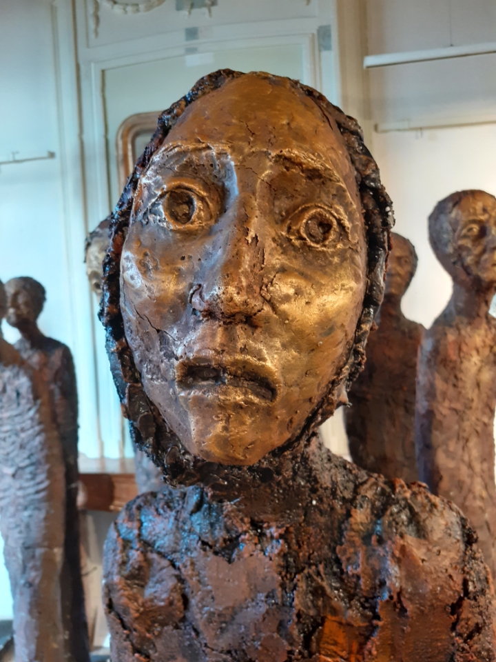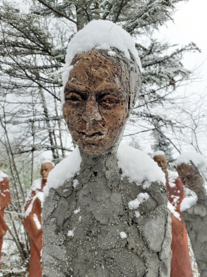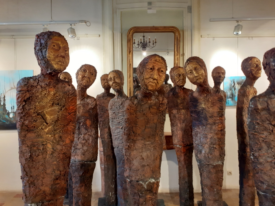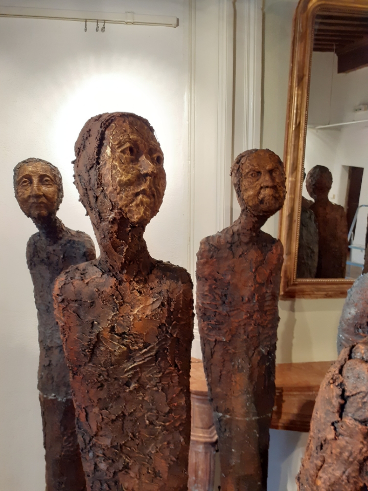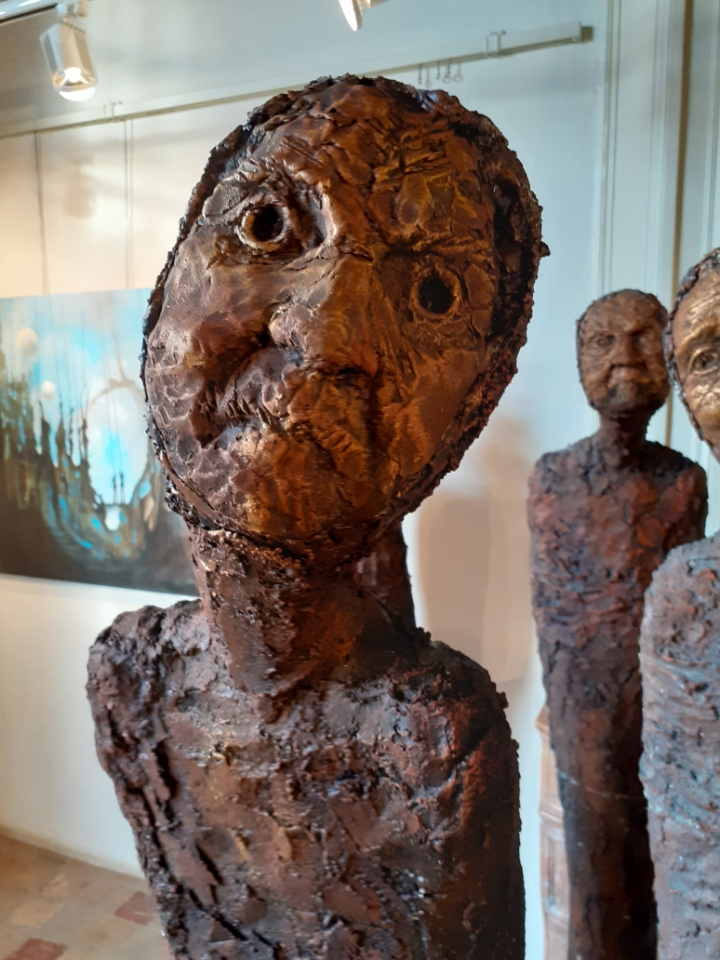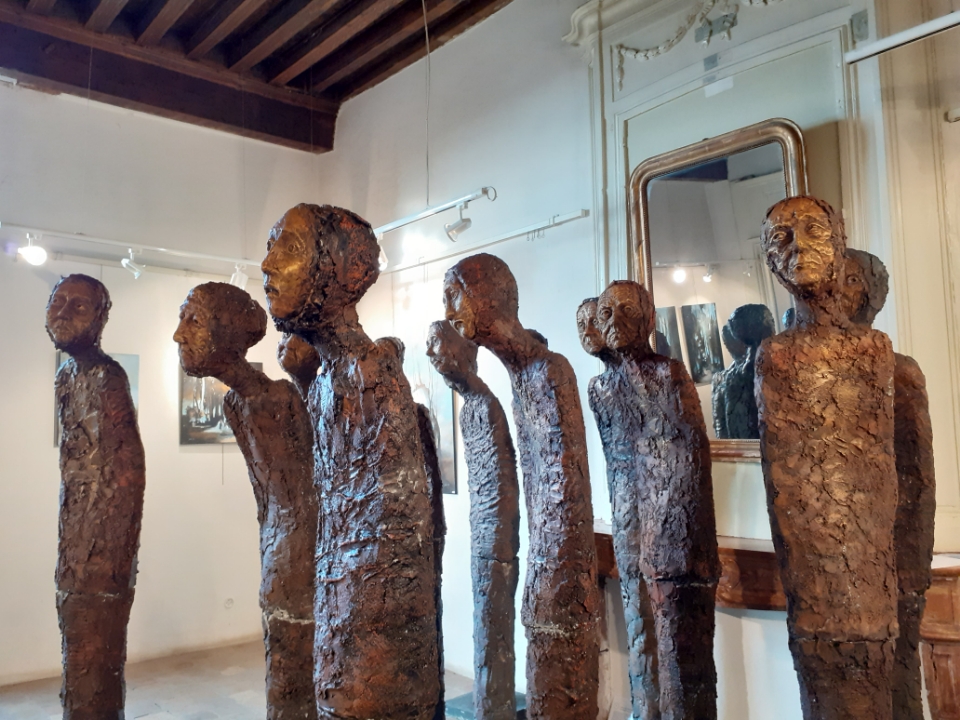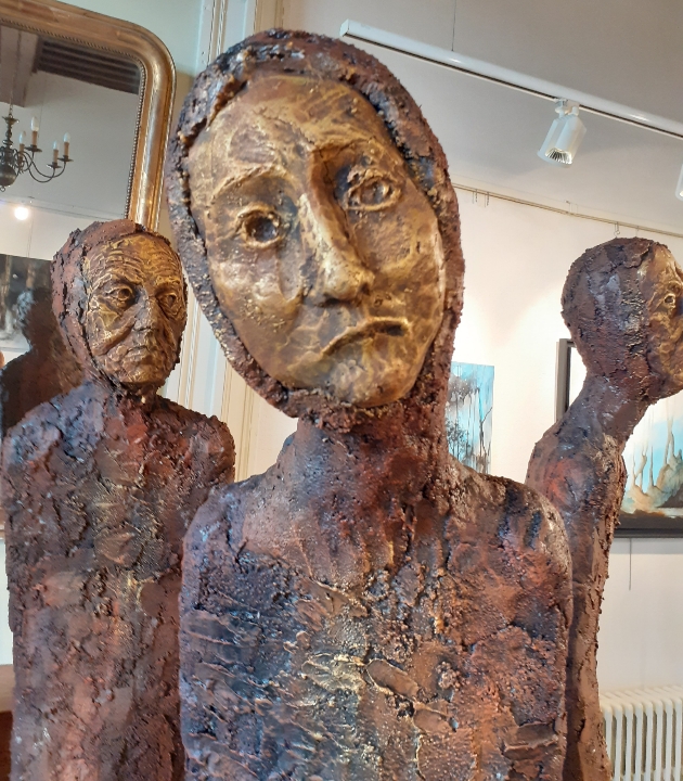 "Corps démunis" est une installation composée de douze sculptures en béton, patinées dans des nuances de gris, de terre et de rouge profond. Chacune mesure 1m90 et représente une présence humaine stylisée, verticale, dense, silencieuse. Le béton, travaillé à la spatule puis patiné, révèle une texture rugueuse, presque organique. Les visages expressifs sont parfois interrogatifs, parfois absents. Les corps sont droits mais vacillants, pris dans une tension intérieure, les bras ligotés aux corps. La patine empourprée appliquée par touches sur les mains, les torses, les visages, évoque la blessure et le doute. Ces figures ne parlent pas. Elles regardent. Elles sont démunies, interrogatives face à un monde de guerre et de violence.