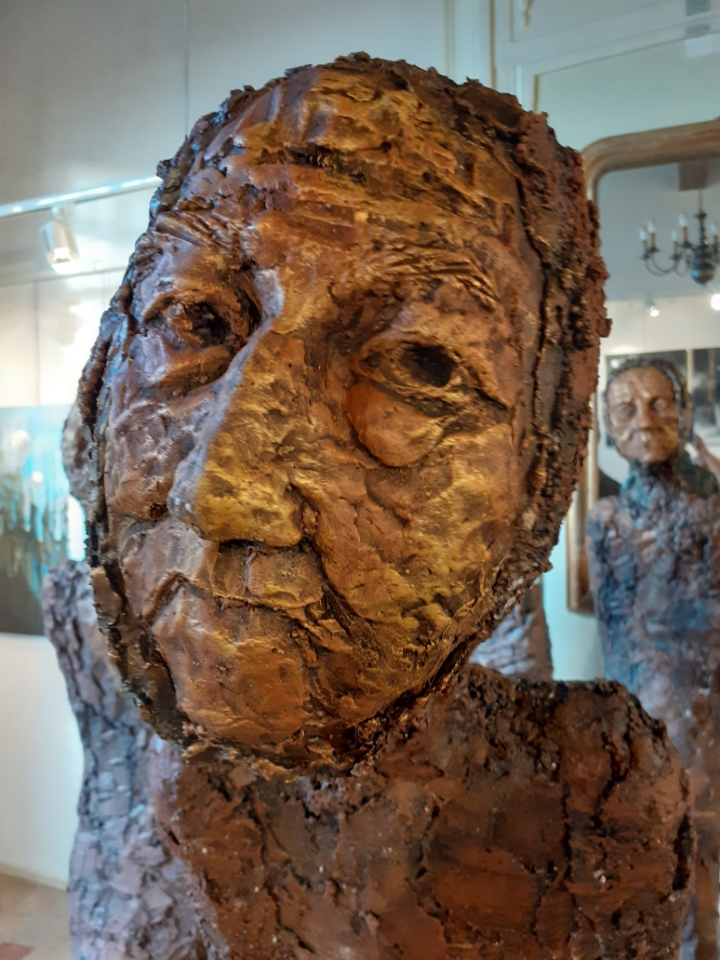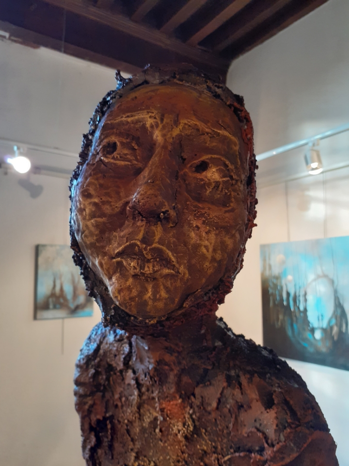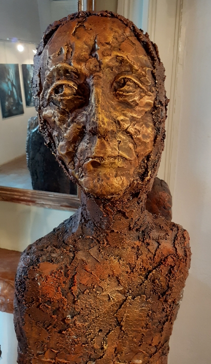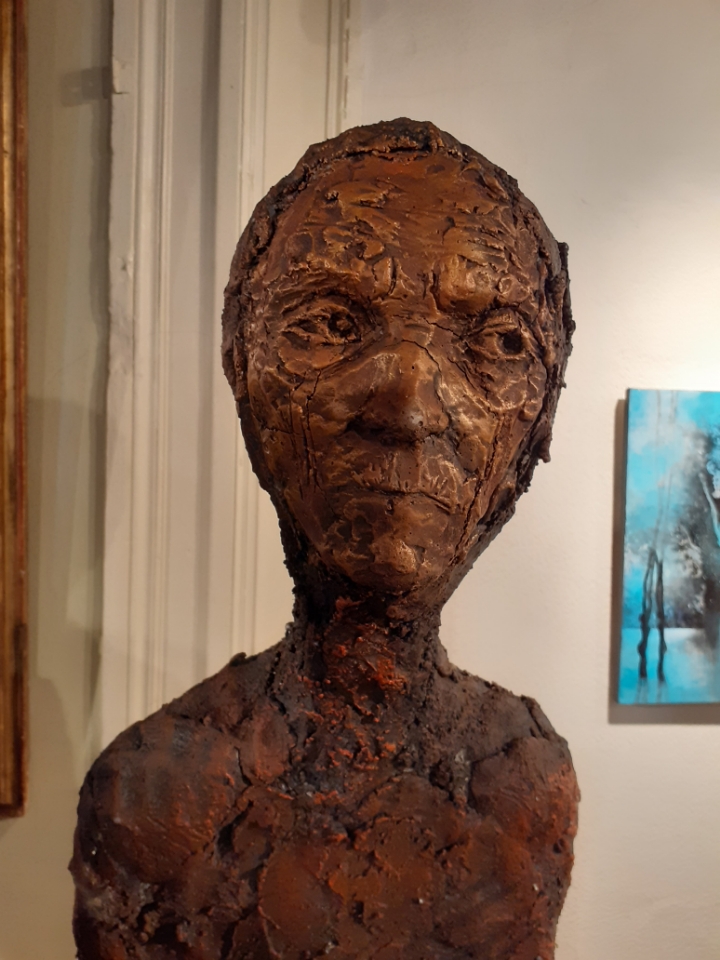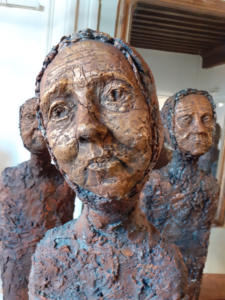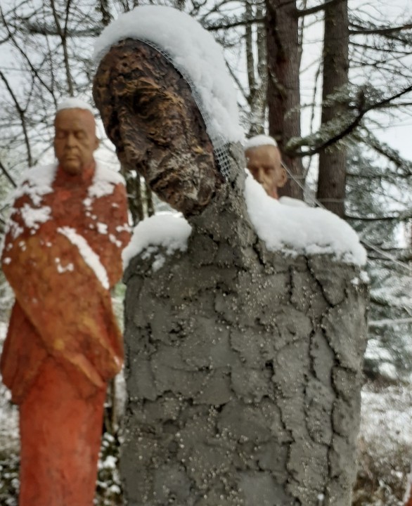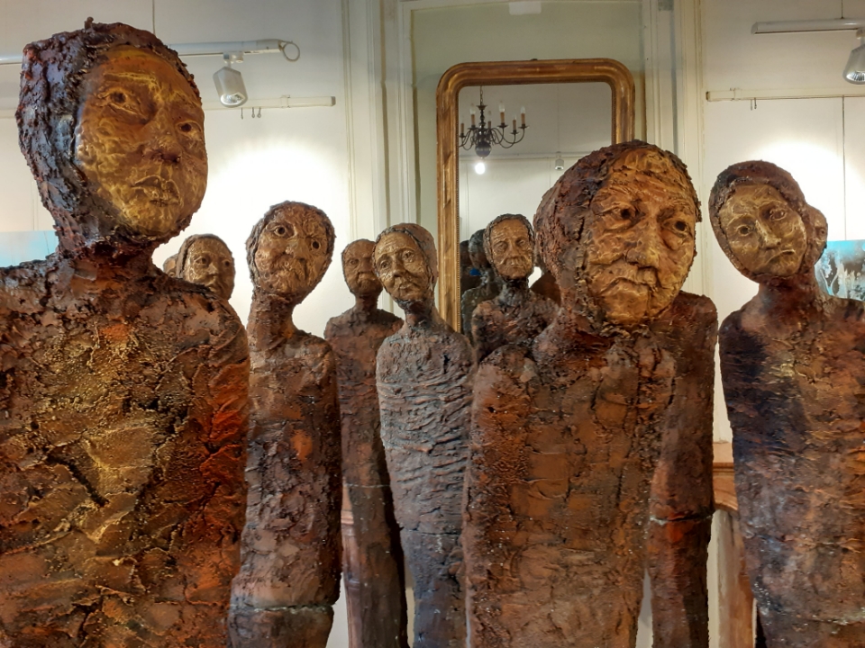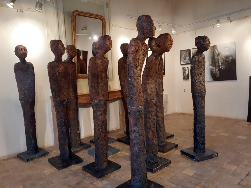 "Corps démunis" est une installation composée de douze sculptures en béton, patinées dans des nuances de gris, de terre et de rouge profond. Chacune mesure 1m90 et représente une présence humaine stylisée, verticale, dense, silencieuse. Le béton, travaillé à la spatule puis patiné, révèle une texture rugueuse, presque organique. Les visages expressifs sont parfois interrogatifs, parfois absents. Les corps sont droits mais vacillants, pris dans une tension intérieure, les bras ligotés aux corps. La patine empourprée appliquée par touches sur les mains, les torses, les visages, évoque la blessure et le doute. Ces figures ne parlent pas. Elles regardent. Elles sont démunies, interrogatives face à un monde de guerre et de violence.